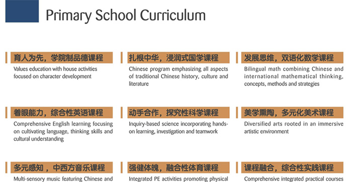 小学阶段提供双语学习环境,展开基于项目的教学活动,提供丰富多彩的课外课程、关注跨学科教学、培养学生良好的阅读习惯,帮助学生掌握中英混合课程所提供的丰富学习内容。